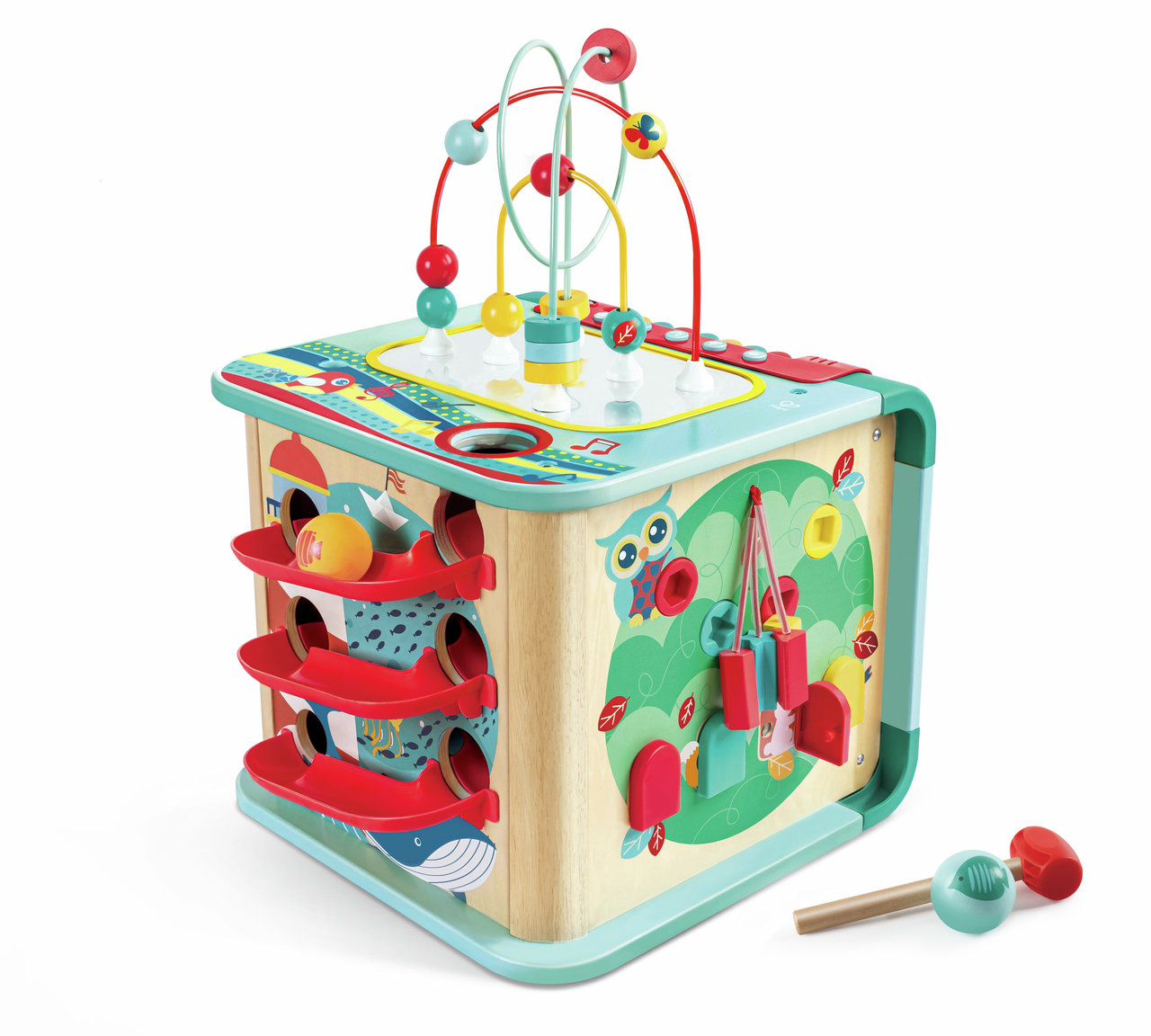 - Comprend des engrenages qui tournent, un jeu d’association de formes, un jeu de balle et un flipper