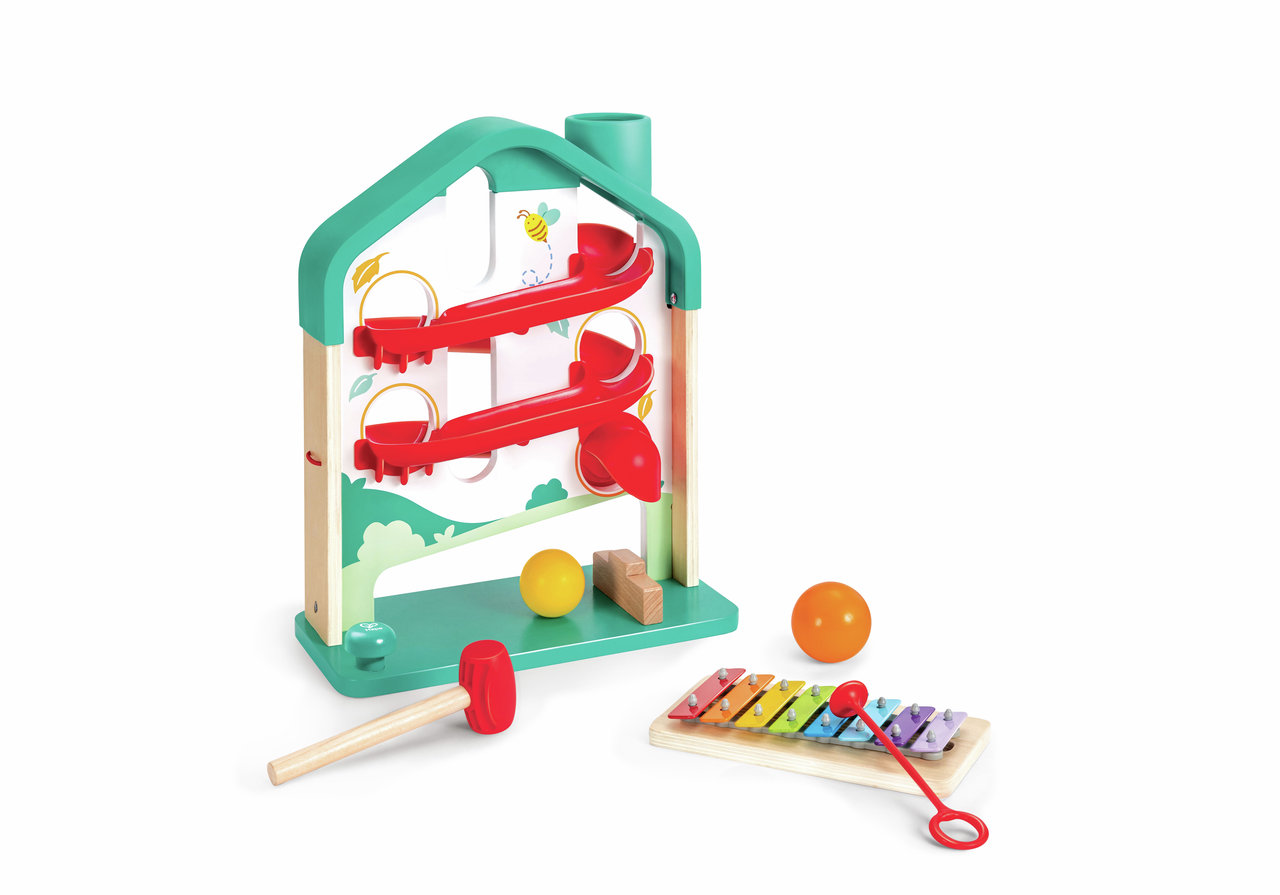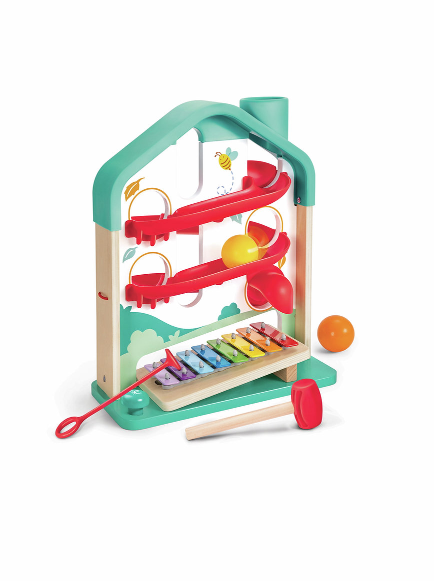 Découvrez les joies de la musique au rythme des balles qui déambulent dans ce toboggan coloré. Possibilité de sortir la planche de xylophone pour un jeu individuel.